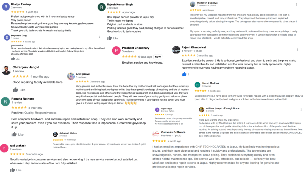 I had an excellent experience with CHIP TECHNOCRATES in Jaipur. My MacBook was having serious issues, and their team diagnosed and repaired it quickly and professionally. The technicians are knowledgeable, honest, and transparent about pricing. They explained everything clearly and even offered helpful maintenance tips. The service was fast, affordable, and reliable — definitely the best MacBook and laptop repair experts in Jaipur. Highly recommended for anyone looking for genuine and professional laptop repair services.